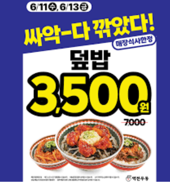 - 역전우동: 6월 11일·13일 덮밥 5종 3,500원(반값), 18일·20일 돈가스 4종 4,000~4,500원(50~52.9% 할인)