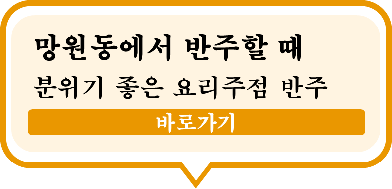 맛있는 안주와 술, 그리고 편안한 분위기를 모두 갖춘 망원동 요리주점 반주. 혼술, 데이트, 소모임, 반려견과의 외출까지 모두 만족할 수 있는 공간이에요.