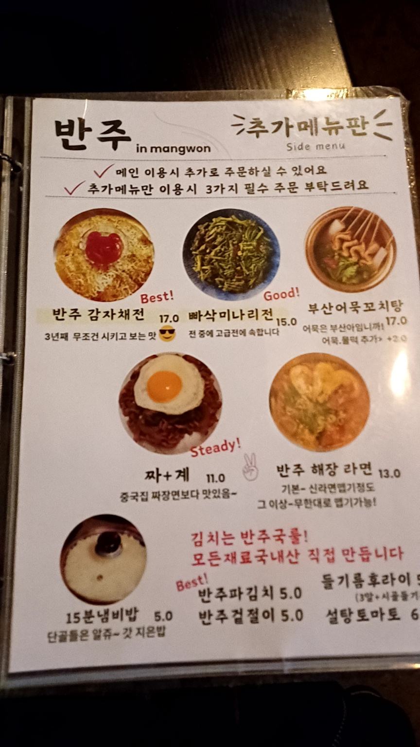 반주는 요리주점답게 안주 메뉴가 다양하고 독특한 조합도 많아요. 가격대는 안주 기준 10,000~15,000원 선으로, 부담 없이 즐길 수 있는 수준이에요. 제가 지금까지 먹어본 메뉴는