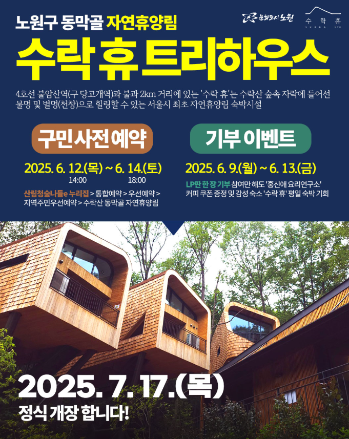 서울에서 진짜 ‘쉼’을 찾고 싶다면, 2025년 7월 노원구 수락산 자락에 개장하는 서울 최초 자연휴양림 ‘수락 휴(休)’를 주목해보세요. TV도, 바비큐장도, 시끄러운 편의시설도 없이, 조용한 산속 트리하우스에서 나무와 LP 음악이 주는 아날로그 감성에 푹 빠질 수 있는 새로운 휴식 여행지입니다. 자연에 맞춘 설계와 레트로 감성, 그리고 특별한 이벤트까지, 진짜 힐링을 원하는 이들에게 꼭 맞는 공간입니다.