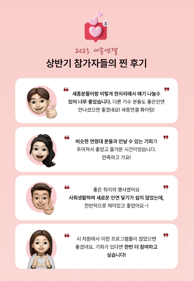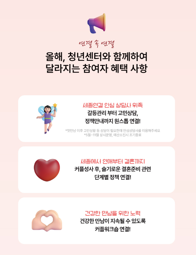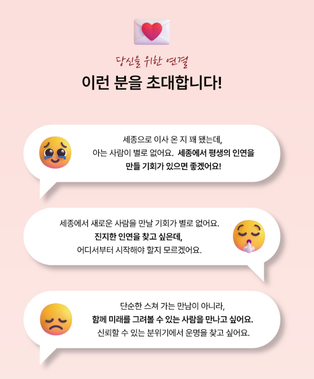 ‘세종에서 연애부터 결혼까지’라는 슬로건 아래, 새로운 인연을 만들고 싶은 청년들에게 교류의 장을 제공합니다.