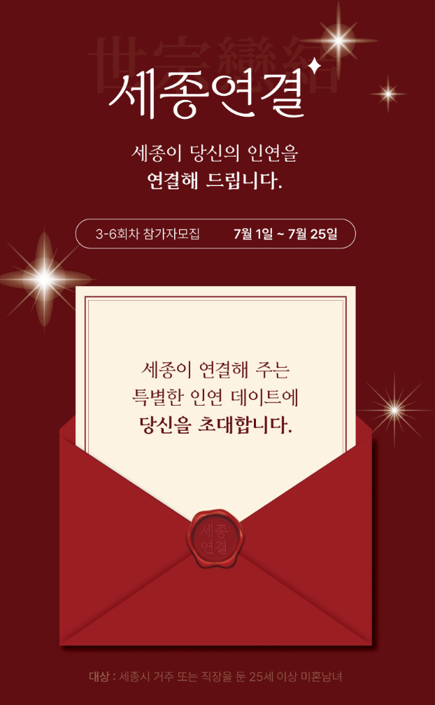 ‘세종연결’은 세종시에 거주하거나 직장을 둔 25세 이상 미혼 남녀를 위한 만남 지원 프로그램입니다.