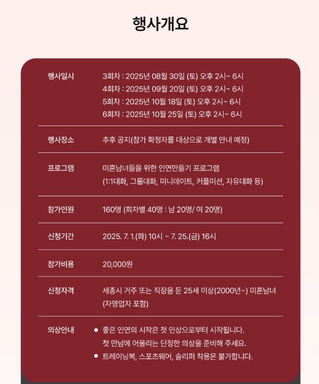 세종시에 거주하거나 직장을 둔 25세(2000년생 이상) 미혼 남녀라면 누구나 지원 가능합니다.