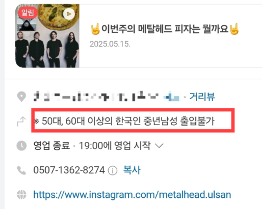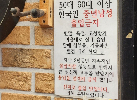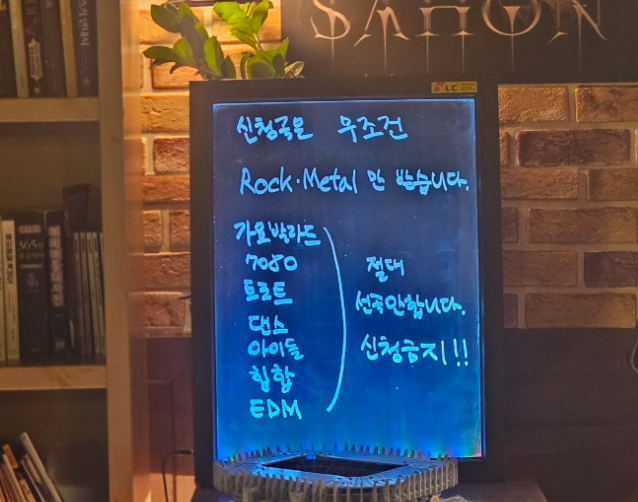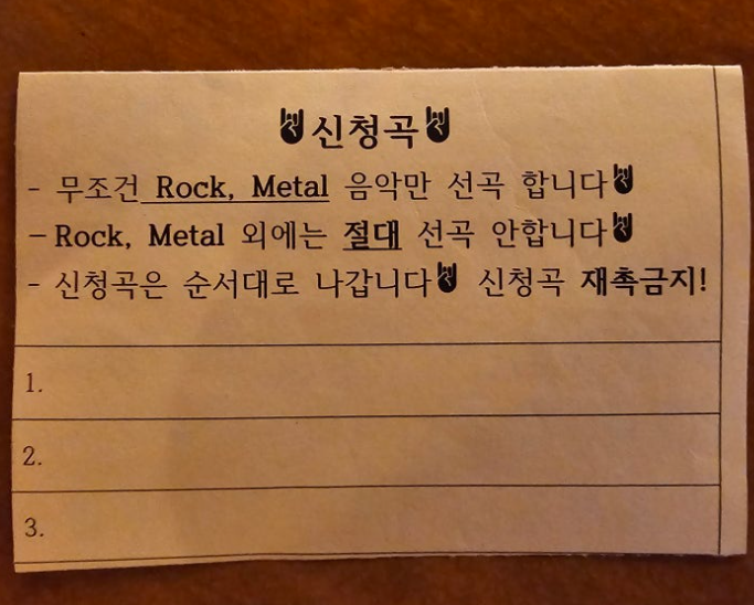 가게 입구에는 “반말, 욕설, 고성방가, 실내 흡연, 담배 심부름, 기물 파손, 평점 테러 협박 등 지난 2년간 지속된 몰상식한 행동으로 큰 정신적 고통을 받았다. 이에 50~60대 한국인 중년남성 출입을 엄격히 금지한다”는 안내문이 붙어 있습니다. 실제로 일부 중년 남성 손님이 임영웅 등 메탈과 무관한 곡을 틀어달라고 요구하거나, 술에 취해 소란을 피우는 일이 반복됐고, 이로 인해 사장님과의 갈등이 누적됐다고 합니다.