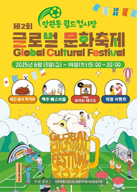 서울 마포구 망원동 월드컵시장에서 제2회 글로벌 문화축제가 2025년 6월 13일 금요일 개최됩니다. 전통시장만의 온기와 글로벌 감성, 레트로 분위기, 온 가족이 함께 즐길 수 있는 다양한 먹거리와 체험, 경품행사까지 가득한 이번 축제 내용을 심플하게 정리해드립니다.