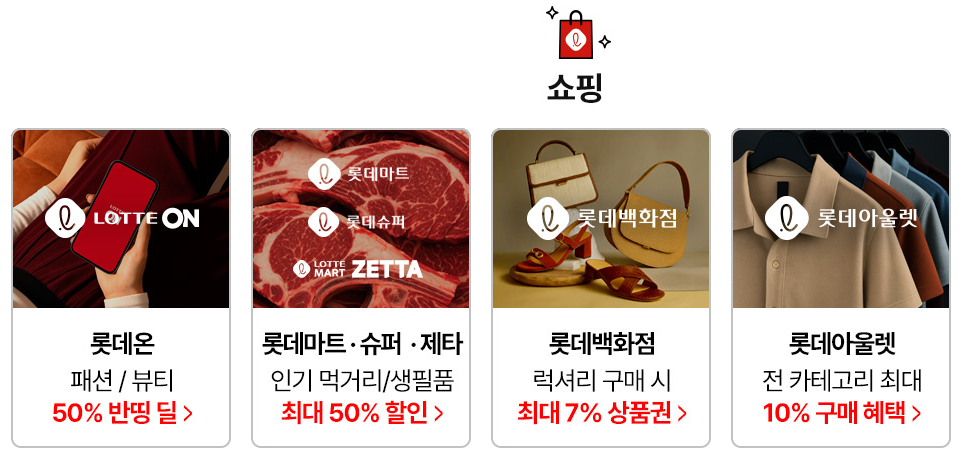 - 최대 100만원 환급 이벤트: 롯데마트, 롯데온, 롯데백화점, 하이마트 등에서 누적 구매액 기준 최대 100만원 환급(한 번만 구매해도 응모 가능, 계열사별 추가 경품 기회 제공)