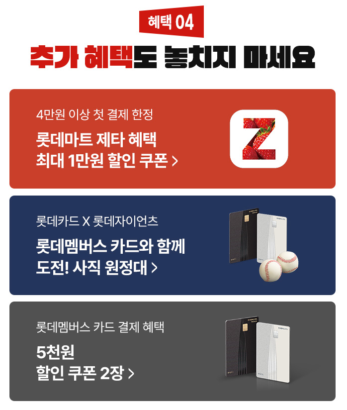 - 스포츠·이벤트: 롯데카드 일정 금액 이상 결제 시 자이언츠 홈경기 관람권, 시구 이벤트 등