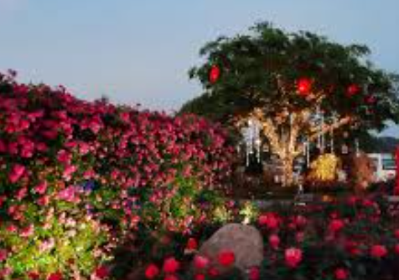 - 드넓은 꽃밭, 산책길, 밤의 조명과 어우러지는 낭만적인 풍경