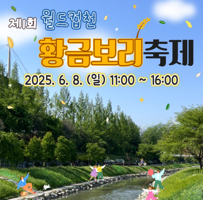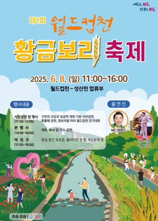 서울 마포구의 대표 생태하천 월드컵천에서 제1회 월드컵천 청보리(황금보리) 축제가 2025년 6월 8일(일) 오전 11시부터 오후 4시까지 개최됩니다. 도심 한가운데서 만나는 초록빛 청보리·황금보리밭과 붉은 양귀비꽃, 다양한 체험과 문화행사가 어우러져 가족, 친구, 연인 모두에게 잊지 못할 추억을 선사할 예정입니다.