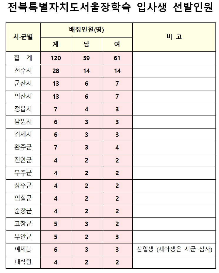 - 접수방법: 전북특별자치도 서울장학숙 홈페이지에서 인터넷 접수