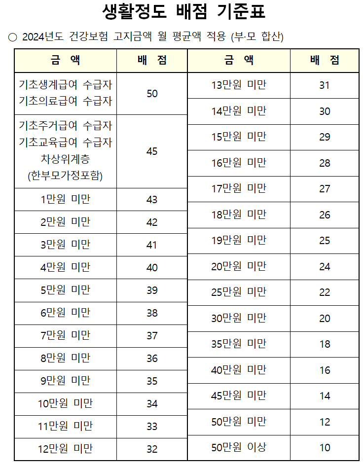 - 가산점: 국가보훈대상자, 다문화가정, 세자녀 이상 가정 등 최대 10점